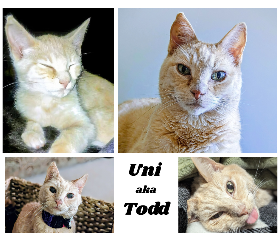 Born in June 2011, Uni (aka Todd) proudly holds the titles of medical and behavioral problem child of the family. From the very beginning, he struggled with separation issues, which led him to suckle on other cats and even himself, sometimes to the point of causing wounds. He’s also known for launching himself onto people without warning just to be closer… followed by some not-so-gentle love bites.